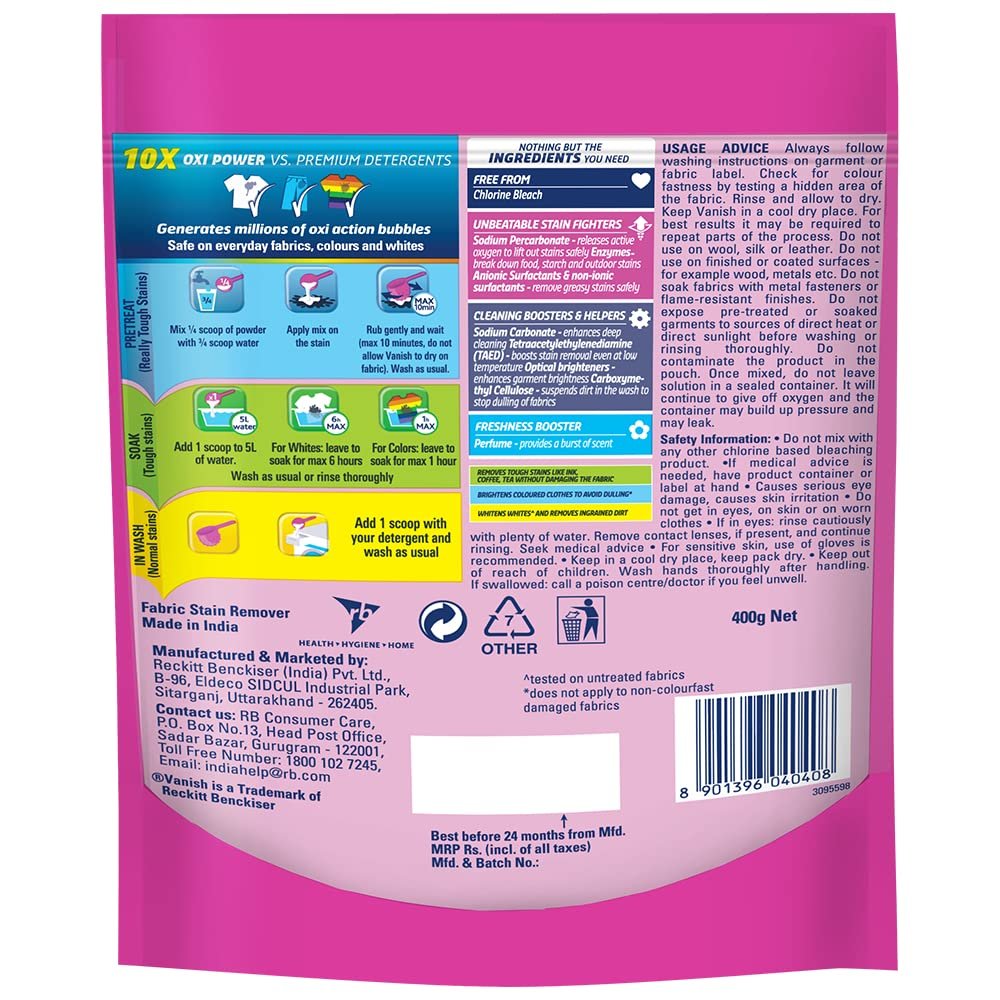 Vanish 400 gm, All in One Powder Detergent Booster | Instant Stain Remover for Clothes | Whitens Whites Brightens Colours| Suitable with all Washing Detergent Powders and Liquids